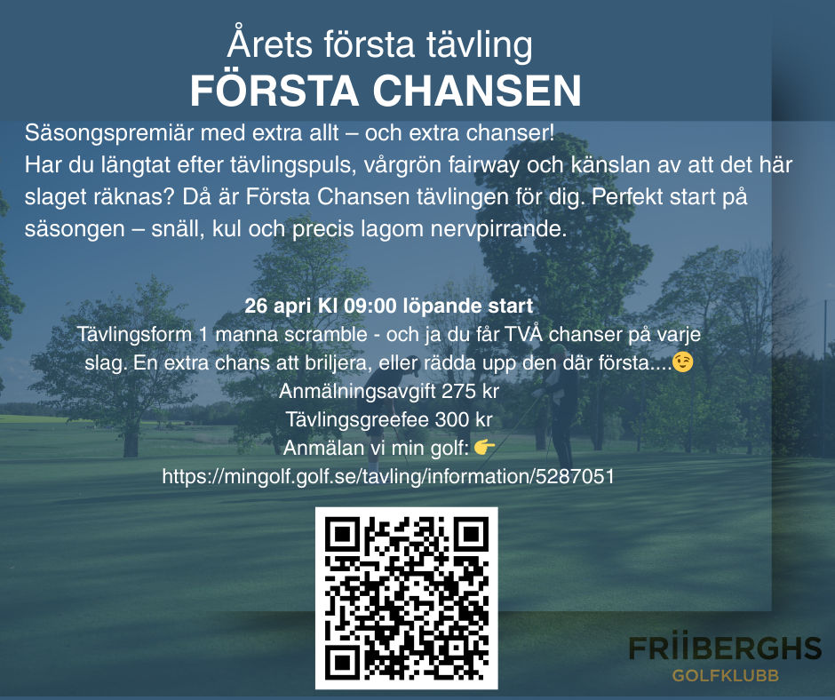 Säsongspremiär med extra allt – och extra chanser! Har du längtat efter tävlingspuls, vårgrön fairway och känslan av att det här slaget räknas? Då är Första Chansen tävlingen för dig. Perfekt start på säsongen – snäll, kul och precis lagom nervpirrande. 26 apri Kl 09:00 löpande start Tävlingsform 1 manna scramble – och ja du […]