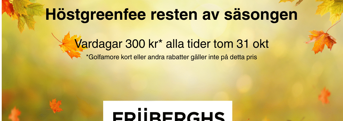Höstgreenfee Vardagar13 oktober 2025/i Nyheter/av Jonna Hallberg300 kr på alla tider på vardagar. Gäller ej för Golfamore eller kan kombineras med andra rabatter https://friiberghsgk.se/wp-content/uploads/2025/10/Hostgreenfee-resten-av-sasongen.png 628 1200 Jonna Hallberg https://friiberghsgk.se/wp-content/uploads/2023/10/Friibergs-GK-logo-1.svg Jonna Hallberg2025-10-13 08:05:092025-10-13 08:05:09Höstgreenfee Vardagar